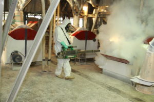Комплекс мероприятий под названием «фумигация» помогает защитить урожай на стадии хранения и транспортировки от клещей, насекомых и грызунов. Для обработки складов, амбаров, элеваторов и заводских помещений используются специальные химические вещества в виде гранул и таблеток. Процесс закладки токсического препарата осуществляется различными способами и требует определенной подготовки и знаний, поэтому должен выполняться исключительно профессионалами. В противном случае это может повлечь за собой угрозу здоровью и жизни окружающих. Окуривание помещений и зерновых запасов ядовитым дымом, так называемая газация — это эффективный метод обеззараживания сырья, так как газ проникает всюду и уничтожает не только насекомых, но и их личинки. При этом фумигант не абсорбируется зерном и безопасен для человека.